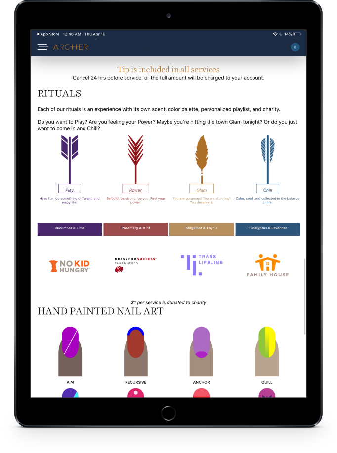 Book your manicure or pedicure appointment online or in our Archer app. Enjoy an incredible waterless nail appointment and walk out without ever reaching for your wallet. Nail polish colors are curated for you into four easy rituals that we bring to you.